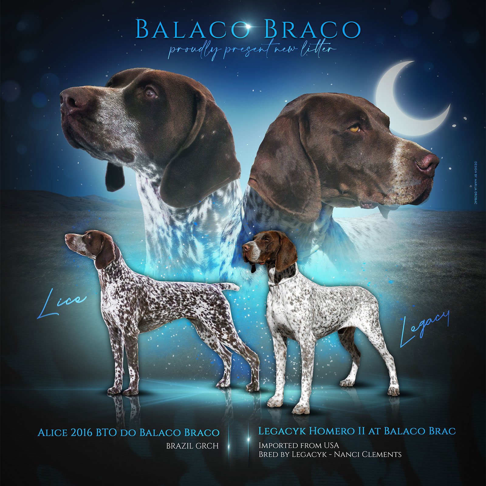 A mãe dos filhotes é a Campeã e Grande Campeã Alice BTO 2016 do Balaco Braco - a Lica, Melhor Braco do Brasil em 2018 (Ranking Dogshow) e irmã de ninhada de Átila BTO 2016 do Balaco Braco, que teve uma carreira histórica nas exposições na América Latina, sendo o Cão #1 do Uruguai entre todas as raças em 2019 e vencedor do BIS da Sicalam, maior exposição do continente, além de ter sido o Braco #1 no Brasil segundo ranking CBKC em 2018.